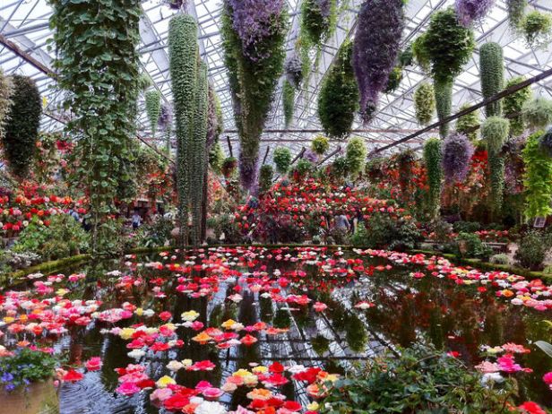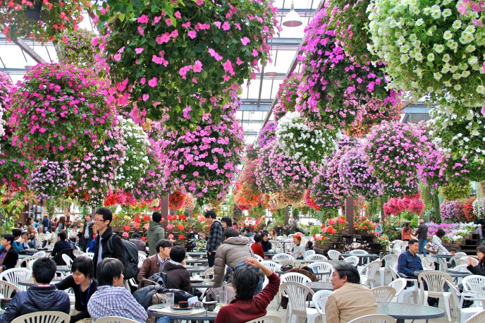 Miles de flores, un torrente de colores que cuelgan del cielo un invernadero de cristal gigante, y debajo de mesas y sillas de bienvenida de los visitantes que van a disfrutar de una copa, escuchar un concierto, una experiencia única en el mundo.