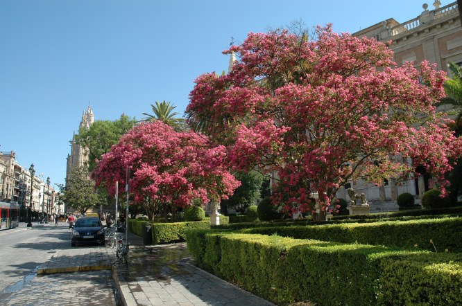 - Sevilla.-Jardines de Cristina Sevilla.-Jardines de la Lonja.-Lagerstroemia indica en flor