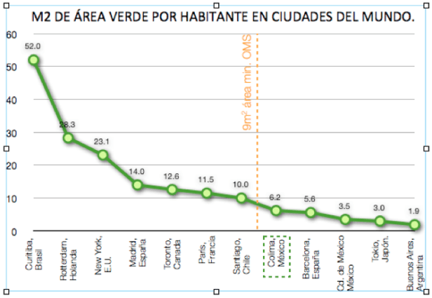 Según recomendaciones de la OMS, las ciudades deben disponer, como mínimo, de entre 10 y 15 metros cuadrados de área verde por habitante, distribuidos equitativamente en relación a la densidad de población. Es aconsejable que esta relación alcance valores entre 15 y 20 metros cuadrados de zona verde útil.