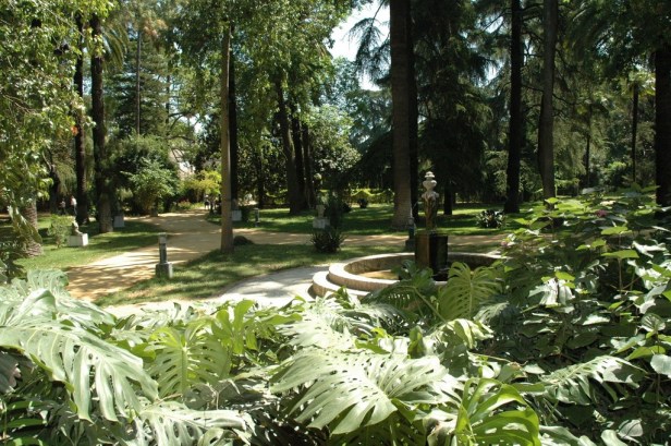 Destacaría entre las plantas que nos podemos encontrar en el jardín actualmente un magnifico grupo de Monstera deliciosa. -Costilla de Adán y grupos de Agapanthus africanus y Clivia miniata entre las praderas de césped que lo conforman a los que han incorporado rosales con flores rojas de la variedad La Sevillana.