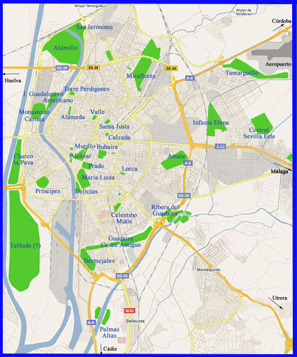 Los espacios verdes más emblemáticos continúan siendo el Parque de María Luisa, los Jardines de las Delicias de Arjona y los Jardines de San Telmo, a los que se les ha incorporado el Parque Celestino Mutis y los Jardines del Prado de San Sebastián, con un total de 9,5 Ha.