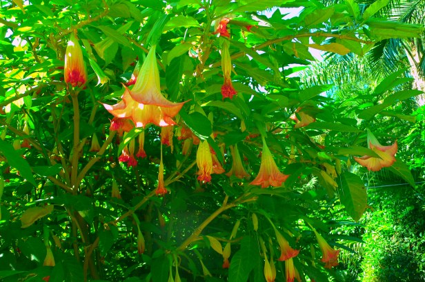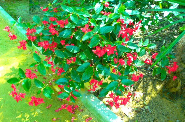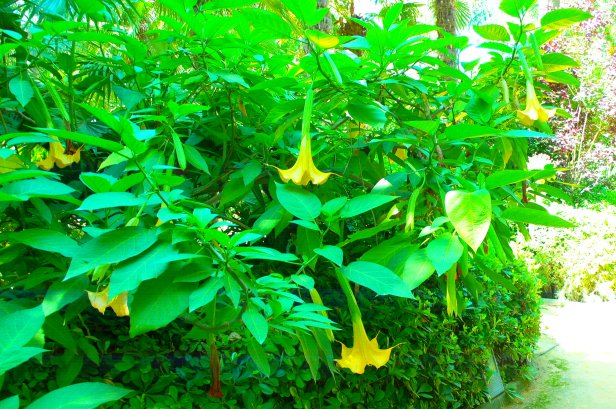 Destaca entre toda la vegetación las Erythrina crista Galli en flor y Erythrina collarines o E. collarodendron apenas con flores, había florecido antes de aparecer las hojas. El primer árbol del coral, árbol nacional de Argentina. Una Choriza speciosa. – Palo borracho, Ficus microcarpa. -Laureles de Indias, algunos recortados, ciruelos japoneses. -Prunus pisardii var. atropurpurea, etc…con innumerables arbustos de flor, en estos momentos los pacíficos. -Hibiscus rosa sinensis lucían sus flores rojas y rosas, las Brugmansias de varios colores con sus trompetas daban la nota de color, seguidas de las delicadas floraciones azules de los Solanum rantonetii.