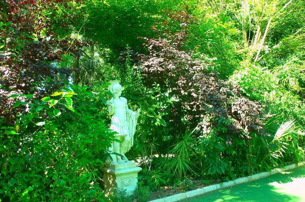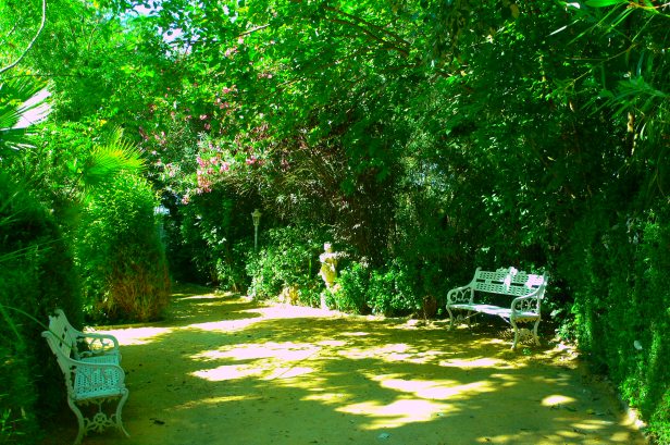 Paseos y rincones románticos con bancos y esculturas nos trasladan entre los distintos espacios de celebraciones en un armónico conjunto de vegetación, entre especies recortadas y otras con su crecimiento natural en un desorden ordenado.