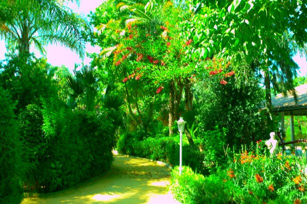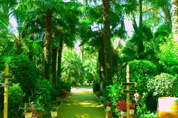 . Nos adentramos en el jardín donde contemplamos la definición de los distintos espacios con abundante vegetaciones Palmeral compuesto de Washingtonia robusta, Trachycarpus fortunei. -Palmera de la suerte y Syagrus romanzoffiana. -Coco plumoso y en el exterior buenos ejemplares de Chamaerops humilis. – palmitos complementan la escena.