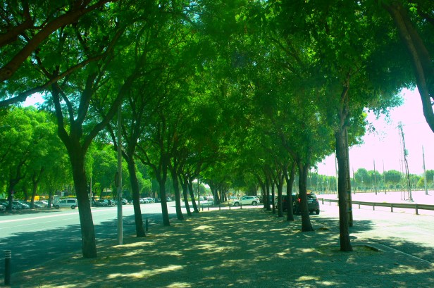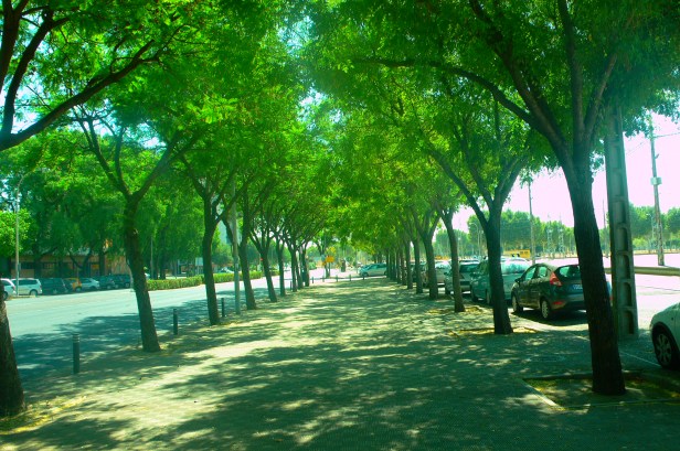 En la calle Flota de Indias, disfrutamos de buenos tramos de paseo, con abundante sombra formados por alineaciones de Jacaranda mimosifolia. -Jacarandá y Styphnolobium japonicum, nombre que ahora se le da a la Sophoras y casi al final de la calle los olmos vuelven a ser los protagonistas.