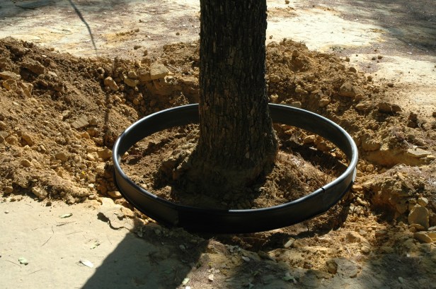 Bandas de plástico para aliviar la compactación del suelo? Ja, ja, ja. Para «evitar» dicha compactación someten al árbol a un estrés arrancando parte de su sistema radicular y le colocan esas bandas. Espero que esas heridas no prosperan y culminen con la seca del propio árbol, árboles ya con cierta edad que no necesitan maquinaria compactando aún más el suelo si cabe.