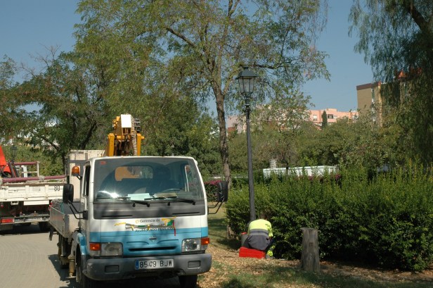 El Parque lucirá un nuevo sistema de alumbrado y para ello están renovando redes e instalando farolas, había movimiento de obras, se estaban colocando bandas de plástico en los arboles del paseo para aliviar la compactación de los suelos (¿) y muchos trabajadores barriendo las hojas de plátanos enfermas que prematuramente caen debido a los fuertes calores.