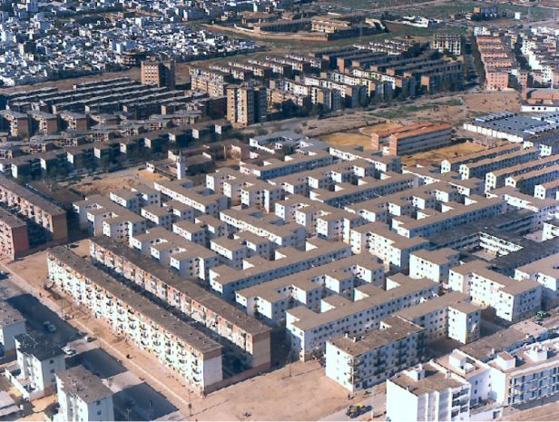 La Obra Sindical del Hogar construyó casi el ochenta por ciento de las viviendas de protección oficial, cerca de catorce mil, entre ellas las correspondientes a los núcleos de Santa Genoveva, Madre de Dios, Nuestra Señora de los Reyes, El Tardón, Ave María, Felipe II, Polígono Norte, Polígono Sur y los seis mil albergues provisionales (1966-1968), Juan XXIII, Nuestra Señora del Rocío y Nuestra Señora de Fátima. La mayoría de estas viviendas fueron edificadas entre 1957 y 1966. Al mismo tiempo se construyeron 3.664 Unidades Vecinales de Absorción (las populares UVA cercanas a Juan XXIII), entre 1968 y 1975..-Los problemas fueron siempre los mismos la urgencia en la creación de viviendas, hacia olvidar la conservación de la urbanización y las plantaciones que se ejecutaron, siendo infame lo ocurrido en las Unidades Vecinales de Absorción donde el Ayuntamiento tuvo que arrancar cientos de árboles mal plantados próximos a las vivienda a las que les ocasionaban importantes daños.