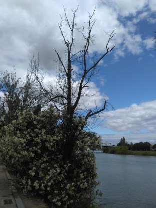 Nada mas bajara la dársena para acceder al paseo Ntra.Sra. de La O peatonalizado con adoquines sin relabrar me encuentro con una mal tratadas adelfas, alguna poderosa razón debía de existir para que se realizada el atentado que ofrecía a la vista una mal llamada poda, hay espacio suficiente para que se desarrollen en libertad., no me sorprendió,me indigno la falta de sensibilidad hacia estas plantas que nos han estado ofreciendo magnificas floraciones blancas hasta hace poco.