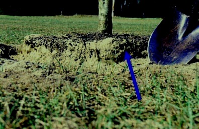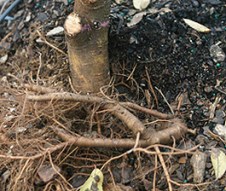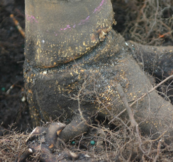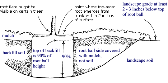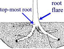 El punto donde la raíz superior se encuentra con el tronco debe estar dentro de los 5 cms. superiores de la superficie. Puede ser visible en la superficie. Observe que el mantillo se extiende en una capa más delgada en el cepellón raíz que alrededor de la raíz. Las excavaciones periódicas del collar de la raíz deben verificar y eliminar las raíces grandes que crecen y se acumulan sobre la bola de la raíz.