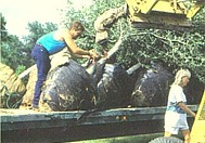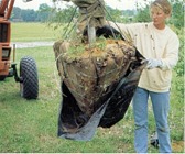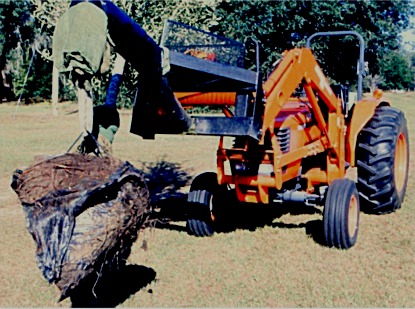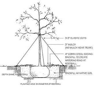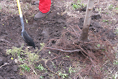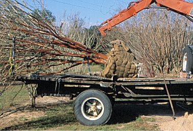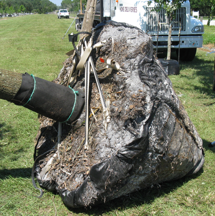 Algunos viveros envuelven plástico negro (vea la foto de abajo a la derecha) alrededor del cepellón de raíz antes de transportarla. Además de ayudar a mantener el cepellón unido, esta práctica parece reducir la pérdida de agua del árbol durante el transporte al sitio de plantación.