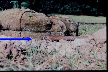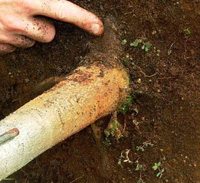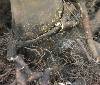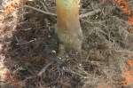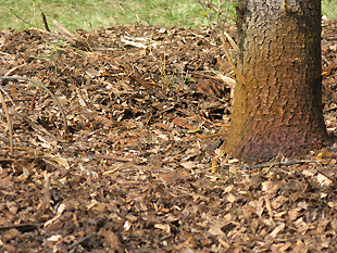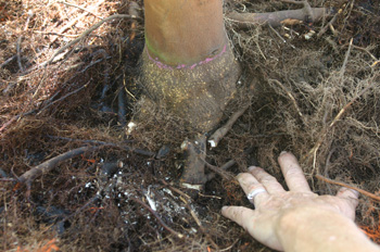 Los árboles con demasiada cobertura apilada en el tronco (foto de la derecha) pueden desarrollar problemas en la base del tronco. Es mejor mantener el mantillo a una distancia de 30 cms.de la base. Si debe cubrir esta área, no aplique más de 2´5 cms. en el suelo. Como resultado de la excesiva podredumbre de la corteza del tronco, los roedores pueden excavar y causar daños en el suelo. la corteza, las raíces pueden crecer en el mantillo y alrededor del tronco, y se recomienda que las raíces se crucen unas sobre otras, lo que puede hacer que los árboles disminuyan y mueran. Elimine el mantillo cerca del tronco para que permanezca seco y desaliente estos posibles problemas (vea: Eliminando el exceso de mantillo). La foto de la derecha muestra una raíz que se zambulle en el suelo. Esto probablemente se debió a que la raíz creció contra el lado del contenedor en el vivero. El mantillo se convierte en una forma conveniente de ocultar este problema potencial. que las raíces de buceo (las raíces que crecen hacia abajo después de ser desviadas por la pared del contenedor) hacen que el árbol sea inestable si no hay raíces laterales cerca para estabilizar árboles. Tratamiento: Cortar la raíz principal justo antes de bucear es una buena solución. Entierre la raíz cortada segmentada con al menos 5 cms. de suelo y mantillo para mantenerlo húmedo para fomentar la formación de nuevas raíces