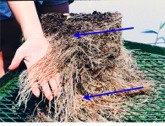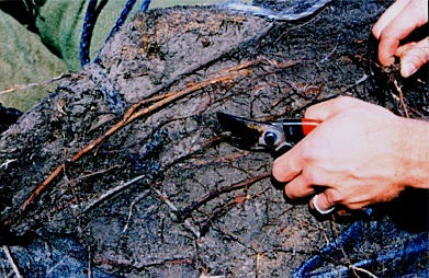 Asegúrese de eliminar cualquier material sintético, como tela o plástico, que pueda estar envuelto alrededor de la bola de raíz (foto de arriba, derecha). Algunos de estos están diseñados para reducir la circulación de raíces en el vivero, pero deben eliminarse antes de instalar el árbol en el paisaje. El afeitado (foto ) de todo el borde exterior de la bola de raíz al momento de la siembra es una innovación reciente que muestra una gran promesa al ayudar a producir bolas de raíz de alta calidad con menos defectos de raíz. Si el productor realizó el mismo afeitado en cada cambio a un contenedor más grande, afeitar el sistema de raíces al plantar, como se muestra, elimina el árbol de la mayoría de los defectos de la raíz.