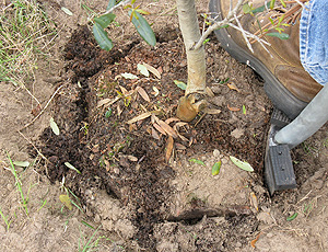 Inserte una pala de punta cuadrada en la raíz tangente al tronco para eliminar toda la periferia exterior. Esto elimina todas las raíces circulares y descendentes en el borde exterior de la bola raíz.