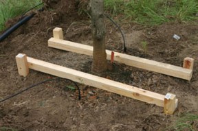 Entutorar el árbol, si es necesario, para mantener firme el sistema radicular en el suelo. Si el sistema de raíces se mueve en el viento, las raíces emergentes podrían romperse y los árboles se establecerán lentamente. Entutorar para mantener un tronco débil en posición vertical no debería ser necesario en árboles con un diámetro de tronco de más de aproximadamente 5 cms.. Si los árboles grandes requieren entutorado para evitar que el tronco se doble, es probable que indique un árbol de menor calidad con un estrechamiento del tronco o un sistema de raíces deficiente. Los árboles que miden menos de 5 cms. pueden requerir estacas hasta que se desarrolle suficiente fuerza en el tronco. Los árboles podrían establecerse más rápidamente y desarrollar un tronco y un sistema radicular ligeramente más fuertes si no se apilan al momento de la plantación. Vuelva para eliminar el entutorado aproximadamente dos año después de la plantación. Deben retirarse los dispositivos de estacado que están conectados o enrollados alrededor del tronco. Los bucles de alambre o las partes expuestas de las cestas de alambre se pueden quitar en este momento. El tutor es el mejor amigo y el peor enemigo del árbol.