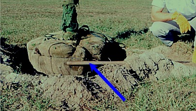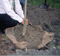 Qué hacer con la arpillera: la arpillera sintética no se descompone en el suelo. Corte la arpillera sintética y plástica lo más abajo posible de la bola de raíz, de modo que el suelo a lo largo del lado de la bola de raíz esté en contacto directo con el suelo de relleno. Es mejor remover toda la arpillera sintética o plástica y desecharla porque las raíces que crecen pueden quedar circundadas como se muestra en la foto de abajo a la derecha. Esto podría hacer que el árbol se caiga o podría decaer lentamente a medida que la tela estrangula completamente las raíces. En climas húmedos,, la arpillera natural tratada (con cobre) se puede dejar a lo largo de los lados del cepellón porque generalmente se pudre en el suelo.