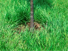 No se recomienda.- Si el césped crece hasta el tronco, los árboles a menudo tienen un rendimiento deficiente (Watson y Green, 1989). El césped y las malas hierbas roban a los árboles la humedad y los nutrientes, y algunos producen sustancias químicas que inhiben el crecimiento de los árboles. Nunca apile el mantillo en forma de volcán contra el tronco. Esto corta el oxígeno a las raíces, puede mantener la irrigación vital y el agua de lluvia, puede mantener las raíces demasiado húmedas en suelos mal drenados y puede pudrir el tronco. Algunos roedores, como los campañoles, también pueden causar daños en el tronco fácilmente si el mantillo se apila allí. Los árboles podrían decaer de este problema.
