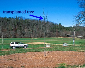He trasplantado roble vivo con calibre de 25 cms de diámetro cuando surgían nuevos brotes en abril con una pala de árbol de 2´25 cms; Todos los árboles sobrevivieron, probablemente debido a la irrigación diaria que recibieron después del trasplante.