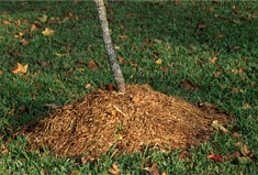 Área de cobertura mínima.- Esta es un poco mejor manejo. El área de cobertura obviamente se mantiene en este tamaño como lo indica el césped de borde. El árbol se beneficiaría de un área de aplicación d mulch más grande. Es mejor mantener el mantillo alejado de la bola de raíz durante varios meses después de la siembra para que el agua llegue a las raíces.