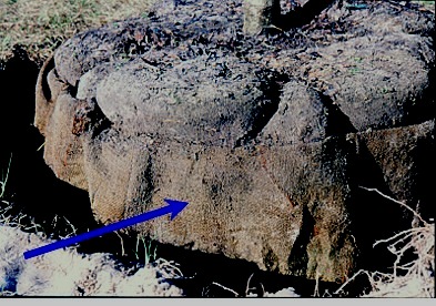 Unos pocos centímetros del cepellón (flecha) permanecen por encima del suelo después de agregar todo el suelo de relleno. Esto asegura que el punto donde la raíz más alta emerge del tronco permanezca por encima del suelo, incluso si la raíz debiera asentarse. El mantillo cubrirá los lados de la bola, pero no se colocará en la parte superior. Una capa gruesa de mantillo colocada sobre el cepellón podría cortar el oxígeno y el agua a las raíces.