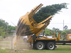 El trasplante de árboles grandes de hasta aproximadamente 40 cms. de diámetro del tronco se realiza con palas de árboles grandes de forma regular (ver foto,).