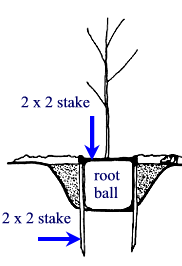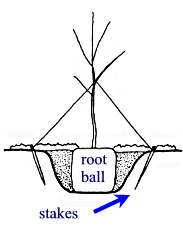 Muchos árboles B & B con buenos sistemas de raíces no requieren estacas para mantenerlos firmes en el suelo porque sus cepellones de raíz son lo suficientemente pesados para evitar el movimiento en climas moderadamente ventosos. Los árboles pueden requerir estacas o tutores si la cesta de alambre se retira al plantar, o si las raíces no son firmes en el cepellón de la raíz. Los arboles de contenedor y raíz desnuda a menudo requieren tutores para mantenerlos firmes en el suelo hasta que las raíces se establezcan debido al peso ligero del cepellón..