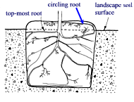 La sabiduría convencional ha sido cortar los lados del cepellón de la raíz del recipiente tan profundamente como sea posible a las raíces circulares severas (foto arriba). También corte las raíces torcidas y circulares que aparecen en la parte superior del contenedor (vea las fotos a continuación). Esto reducirá la probabilidad de que el árbol muera debido a estos defectos graves de la raíz más adelante. En la mayoría de los casos, el corte agresivo de la raíz tiene un impacto negativo pequeño o nulo en el árbol, siempre y cuando los árboles estén irrigados. Los aspectos positivos superan con creces los aspectos negativos. Quite las raíces que están colocadas en la parte superior de las raíces principales, como se muestra abajo. Una nueva investigación (2008) sugiere que cortarlos cepellones de raíces no produce más raíces en el suelo del paisaje ni mejora la estabilidad de los árboles en el paisaje. En su lugar, pensamos que se debe quitar todo el cm. exterior de los lados y la parte inferior del cepellón.