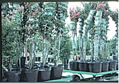 En el mercado hay muchos tipos de contenedores diseñados para reducir el círculo de raíces. Muchos de ellos reducen la cantidad de raíces que rodean el contenedor (Marshall y Gilman 1998). Los tipos de recipientes parecen tener poco impacto en la supervivencia y el crecimiento después del trasplante. En un estudio reciente, los robles vivos cultivados en contenedores tratados con cobre en la superficie interior estaban más estresados que los cultivados en contenedores convencionales en las primeras tres semanas después de la plantación en el paisaje sin riego. Sin embargo, con el riego diario no hubo diferencia en los niveles de estrés. El aumento del estrés hídrico puede deberse a la falta de raíces en el exterior de las raíces plantadas en recipientes recubiertos de cobre (Arnold y Struve 1993; Gilman y Beeson 1994). Los de los contenedores convencionales tienen raíces en el borde exterior del cepellón de la raíz, lo que proporciona un contacto íntimo con el suelo húmedo del paisaje. Esto puede proporcionar una mayor captación de agua que los árboles de contenedores recubiertos de cobre. Cuando se interrumpió el riego regular de cuatro a seis semanas después de la plntación, los niveles de estrés fueron casi iguales y el crecimiento de las raíces en el suelo del paisaje fue similar para los árboles plantados de ambos tipos de contenedores. Un estudio posterior mostró que Scarlet y Red Oak crecieron en recipientes recubiertos de cobre después de plantar en el paisaje que los árboles cultivados en contenedores convencionales (Struve 1993). El líder central se dejó intacto y no murió tan a menudo en árboles de recipientes recubiertos de cobre. Sin embargo, no hubo diferencia en el recrecimiento entre los tipos de contenedores para Red Maple.-Acer rubrum o Sweetgum.-Liquidambar styraciflua,. Los árboles de todos los tipos de contenedores sobrevivieron igualmente bien. Una de las ventajas de plantar desde recipientes recubiertos de cobre es que los cepellones de raíz tienen pocas raíces circulares, si es que las hay, lo que las hace superiores a los árboles que crecen en recipientes convencionales de lados lisos. Un estudio adicional indicó que el arce rojo plantado de siete tipos de recipientes diferentes respondió aproximadamente igual de bien después del trasplante al paisaje (Marshall y Gilman 1998) hasta 5 años después de la plantación (documento en preparación, 2002). El roble vivo de las bolas de raíz de perfil bajo sobrevivió mal después del trasplante en comparación con otros tipos de recipientes si no se proporcionó irrigación con regularidad (Gilman 2001). La supervivencia fue similar entre los tipos de contenedores si el riego se proporcionó a intervalos regulares dos veces por semana en la temporada de crecimiento después de la siembra.árboles. La línea de sustrato se muestra en el tronco como una línea roja.
