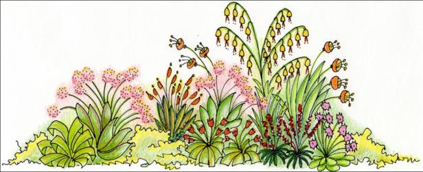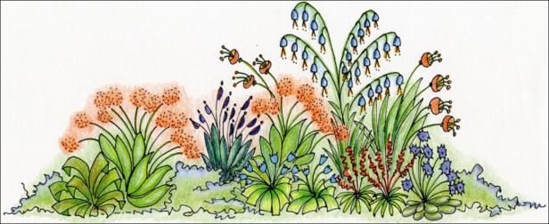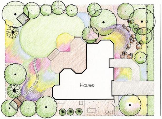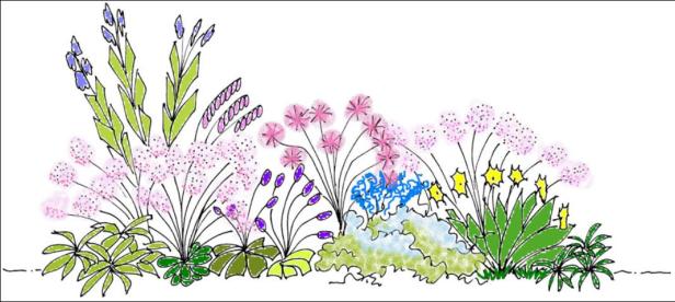 Estudios de color . La mayoría de los diseñadores realizarán un estudio de color al diseñar el material vegetal en el diseño. Se puede hacer un estudio de color simple en la vista de planta usando lápices de colores para agregar color donde se ubicarán las plantas (Figura 5). También es útil dibujar una vista lateral (sección) simple de materiales vegetales en una composición propuesta y colorear las formas de las plantas para visualizar cómo se verán los colores adyacentes entre sí (Figura 6).