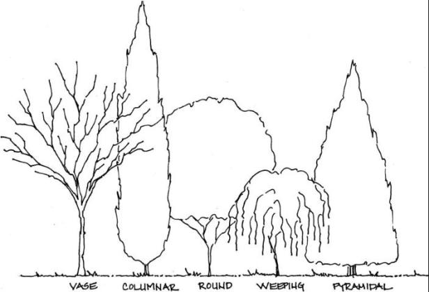 Las formas de los árboles son a menudo dominantes en el jardín debido a su tamaño. Los árboles también son las plantas más funcionales en el paisaje, brindan sombra y bloquean las vistas, así que al elegir una forma de árbol, considere la función primero. Crear un área sombreada en el jardín requiere un árbol redondo u ovalado, mientras que una pantalla generalmente requiere una forma más columnar o piramidal, y una forma de árbol que llora es un buen punto focal. También es importante asegurarse de que el árbol no supere el espacio y requiera una poda severa. Elija el árbol por su tamaño y forma madura en relación con el espacio. Las formas de árboles comunes incluyen jarrón, columnar, redondo, que llora y piramidal (Figura 1).