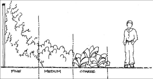 La textura afecta a la percepción de la distancia y la escala. Para hacer que el espacio se sienta más grande, ubique las plantas de manera que las texturas finas estén a lo largo del perímetro exterior, las texturas medianas estén en el centro y las texturas gruesas estén más cerca del espectador (Figura 13). El pequeño tamaño de la textura fina retrocede en el paisaje y se percibe como más lejos.