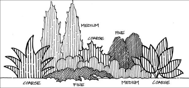 La textura se refiere a qué tan gruesa o fina es la superficie general y las hojas individuales de la planta que se siente o se ve (textura visual percibida). Como la forma, una variedad de texturas proporciona interés y contraste en el paisaje. La textura se puede encontrar en el follaje, las flores, las cuchillas y la corteza de la planta, así como en el patrón general de ramificación de la planta. El tamaño y la forma de las hojas determinan con mayor frecuencia la textura percibida de la planta. Una planta generalmente se puede describir como que tiene una textura gruesa, media o fina (Figura 7). La textura gruesa es más dominante que fina y tiende a destacarse individualmente, mientras que la textura fina es más subordinada y tiende a unificar las composiciones.