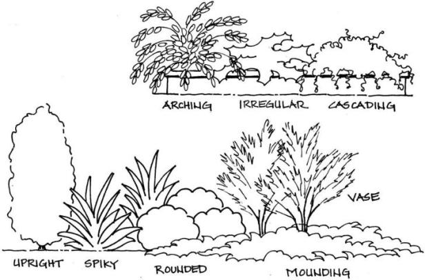 Los arbustos tienen una variedad de formas, por lo que es importante considerar cómo se verán los arbustos cuando se agrupen. Los arbustos que se amontonan y se extienden se ven mejor en una masa, mientras que las formas en cascada y puntiagudas funcionan bien para plantas de especimenes individuales. Las formas de arbustos incluyen arcos, irregulares, en cascada, verticales, puntiagudas, redondeadas, en montículos y en forma de jarrón (Figura 2). La forma del arbusto determina su función más adecuada. Las formas verticales, de jarrones, de montículos y redondas funcionan mejor como pantallas y amortiguadores más altos; Las formas irregulares y extendidas funcionan bien como fundas; y las formas arqueadas, en cascada, piramidales y puntiagudas funcionan mejor como puntos focales.