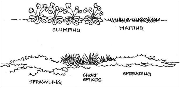 Las plantas que cubren el suelo o las camas tienden a tener las formas más complejas, pero generalmente se ven mejor en masas porque a menudo son pequeñas y tienen poco impacto como plantas individuales. Las masas de plantas que cubren el suelo generalmente pierden su forma individual y se parecen a una sola planta, por lo que es importante considerar cómo se verán las plantas como una masa. Las formas de cobertura del suelo incluyen aglomeraciones, esteras, extensas, puntas cortas y propagación (Figura 3). Las esteras, la propagación o la expansión de las plantas se utilizan para formar una cubierta sólida y baja sobre grandes áreas. Las plantas que crecen en grupos o picos cortos se pueden usar en masas más pequeñas y funcionan bien en macetas o áreas cerradas.