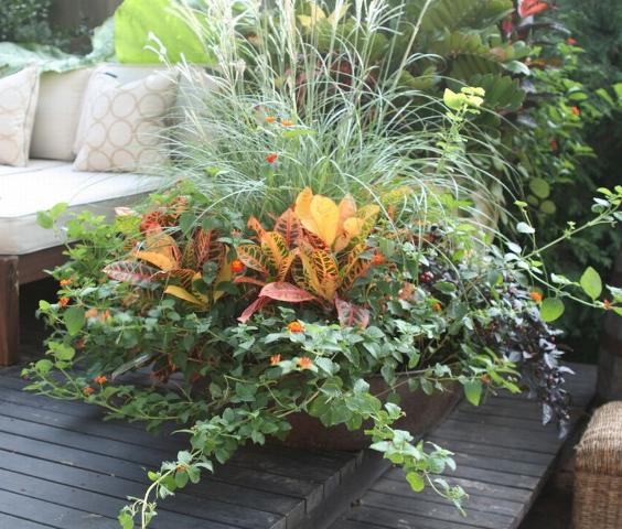 3. Considere la forma de plantas adyacentes. Para la variedad, elija plantas que contrasten con formas sorprendentemente diferentes; por ejemplo, coloque una forma puntiaguda al lado de una forma suave y apelmazada. La Figura 5 muestra un contenedor con una combinación de formas de arbustos y cubiertas del suelo, que incluyen plantas arqueadas, puntiagudas, en cascada, en expansión y agrupadas.