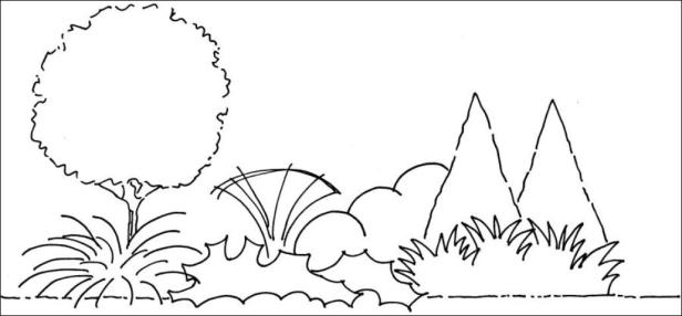 Se puede utilizar un estudio de formulario simple (Figura 6) para determinar cómo las diferentes combinaciones de formularios crean espacios de equilibrio y relleno. Las plantas se dibujan en un esquema simple para centrarse en la forma y el arreglo. Los estudios de formularios también son útiles al ubicar formularios para funciones, como bloquear vistas o crear sombreados. Por ejemplo, para determinar si el formulario es adecuado para bloquear la vista desde una ventana, dibuje la planta, a escala, frente a un dibujo a escala de la pared y las ventanas.