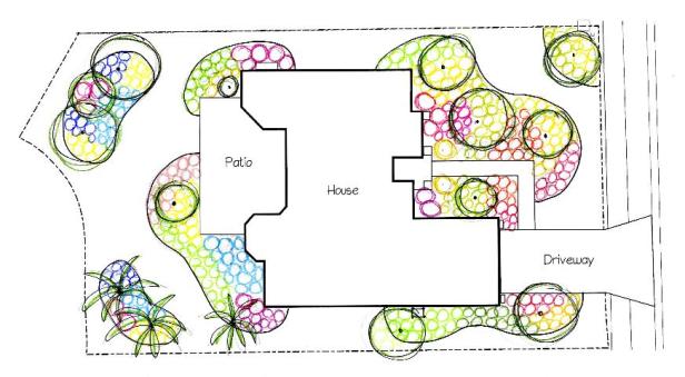 Figura 2.  Plan preliminar que muestra arriates de plantas, ubicaciones de árboles y combinaciones de colores.  Crédito: Gail Hansen