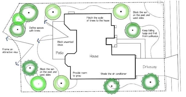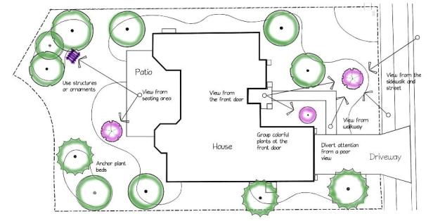 El desarrollo de un plan conceptual que muestre el diseño general propuesto del material vegetal es el primer paso en el proceso. El plan conceptual se basa en el análisis del sitio y las necesidades de la persona o familia que utiliza el espacio. Esto asegura que el plan se base en las condiciones del sitio y la función deseada de las plantas. Ver Diseño del paisaje: Análisis de las condiciones del sitio  Para más información sobre el inventario y análisis del sitio. La Figura 1 es un plan conceptual que muestra la ubicación del material de la planta con notas funcionales para crear sombra y privacidad, controlar vistas, ocultar utilidades antiestéticas y llamar la atención sobre la entrada frontal como punto focal. Las etiquetas que describen la función de las áreas plantadas guían la selección de plantas para cumplir mejor la función, como los árboles de dosel ancho para la sombra y las plantas interesantes y coloridas para el punto focal.