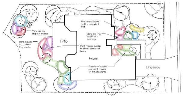 Las plantas en masa son los arbustos medianos y pequeños y la cubierta del suelo que llenan los lechos de las plantas. Estas plantas constituyen la mayor parte del material vegetal en las camas y deben tener una variedad de texturas, colores y formas de interés. Un enfoque para ubicar plantas en masa es dibujar «burbujas» de forma libre o irregulares dentro de los lechos de plantas para mostrar la ubicación y la extensión de un grupo de plantas en particular (Figura 6).