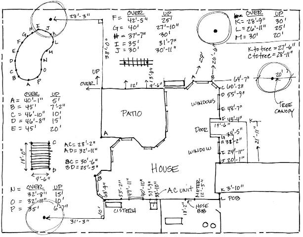 Necesitará una o dos cintas métricas largas, de 30 o 60 metros de largo. Un destornillador con un eje largo es útil para anclar un extremo de la cinta si no tiene un ayudante. Recuerde mantener siempre la cinta apretada al medir y revisar sus números dos veces antes de grabar para evitar mediciones inexactas. Antes de comenzar, dibuje un simple boceto en el que registrar las medidas. El boceto no tiene que ser de un tamaño particular, siempre que haya suficiente espacio para escribir los números. Dibuje las líneas de propiedad, la huella de la casa y las características del paisaje en una hoja de papel en blanco. Asegúrese de que el contorno de la casa sea preciso para todas las esquinas, ventanas, puertas y cambios de dirección. En la Figura 2 se muestra un boceto típico. Después de tomar las medidas del sitio, vuelva a dibujar el sitio a escala. Para volver a dibujar el sitio,