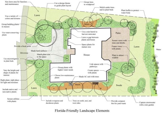 Los elementos de diseño se ubican espacialmente en el patio según la ecología, la función y el atractivo estético. El plan de paisaje de ejemplo (Figura 1) ilustra la ubicación de los componentes en un paisaje residencial típico. Si bien los planes modelo incluyen ejemplos de casi todos los elementos, los elementos más críticos para un patio apto para la Florida son aquellos que afectan la salud y la función ambientales.