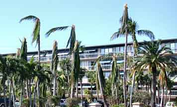Tradicionalmente, se les ha pedido a los arboristas que poden las palmas antes de la llegada de la temporada de huracanes. Las palmas «cortadas por el huracán» tienen la mayoría de sus hojas cortadas, dejando solo un mechón de las hojas más jóvenes intactas (Figura 12). La intención era reducir la resistencia al viento en la palma, protegiéndola de los daños del viento. Sin embargo, las observaciones de palmas después de las severas temporadas de