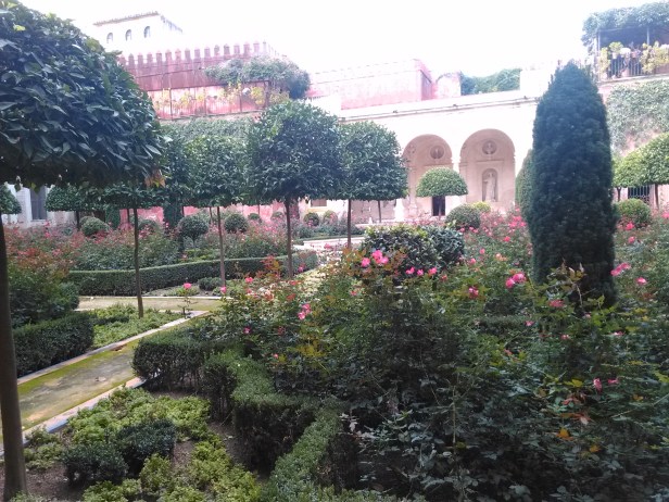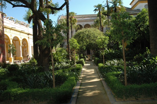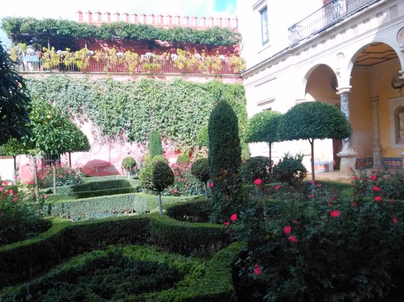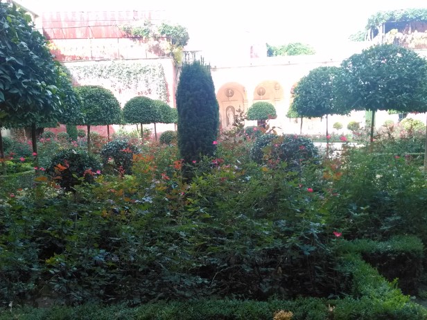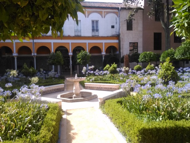 Atravesamos el Patio Central para dirigirnos al jardín grande, irreconocible este no era el jardín que yo había conocido, la reforma ha sido total desde hace años, ha desaparecido el cenador que ocupaba la parte central cubierto de rosales banksiae ,donde permanece la fuente de mármol, un magnifico árbol del Coral,.-Erythrina crista galli, árbol nacional de Argentina ha desaparecido, los parterres rodeados de setos de boj que albergaban las tradicionales clivias y agapantos se han sustituido por un rosal floribunda moderno inapropiado para un jardín histórico, unos naranjos arquitecturizados recortados en topiaria ocupan el conjunto del jardín, el ejemplar de Jazmín de Madagascar.-Stephanotis floribunda que ocupa parte de los muros del edificio existe,,otras plantas especiales que configuraban el jardín tradicional han sido eliminadas,Justicia carnea, Brugmansia arborea,Philadelphus coronarius etc…desaparecidos tambien las palmeras, los Trachycarpus fortunei