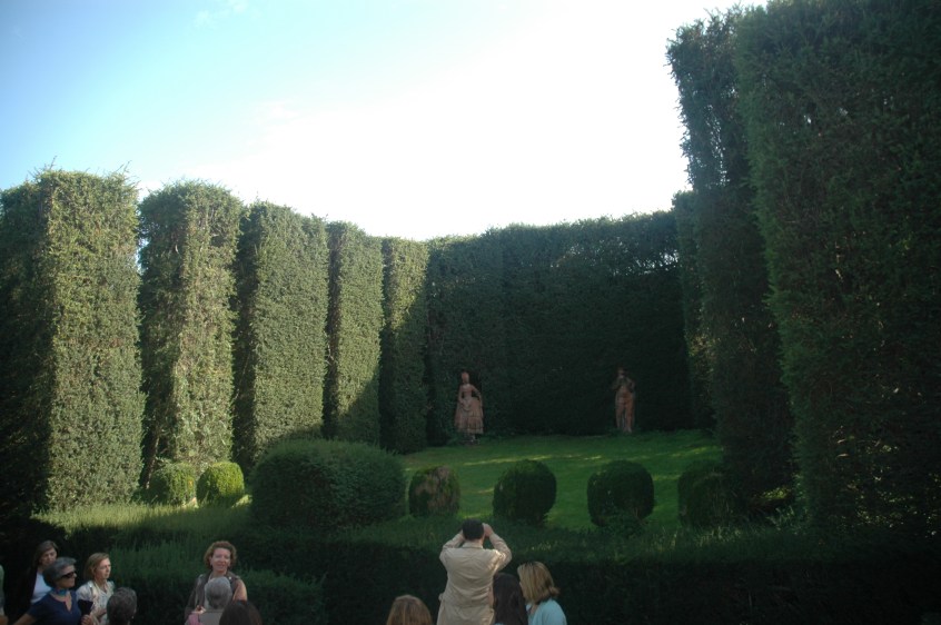 El jardín tiene un carácter teatral con setos de boj, estatuas y altos cipreses. .