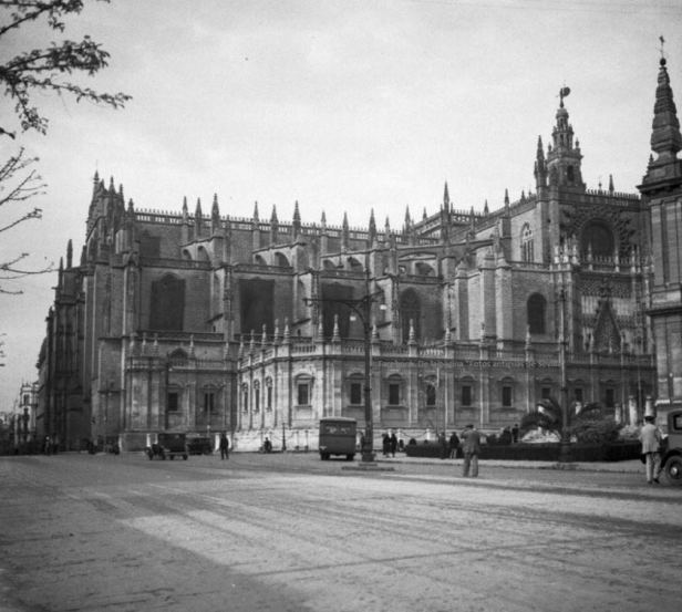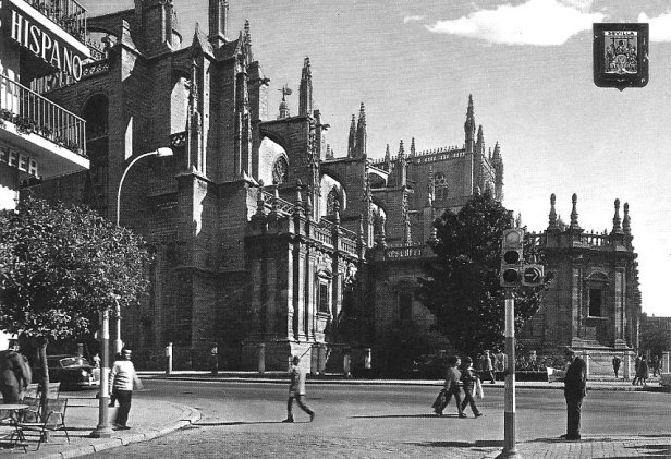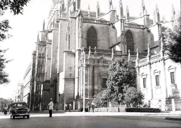 El Magnolio en la esquina de la catedral sin el monumento a Martinez Montañés en el año 1965
