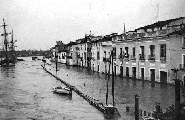 En la primera foto correspondiente a una riada que hubo en el 1982,aparece la calle inundada sin árboles.