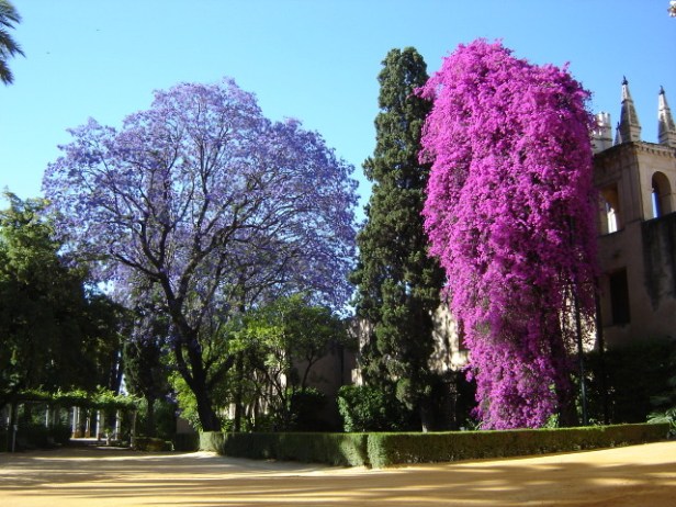 Al final de la primavera muchas calles y jardines sevillanos se pintan de azul por la floración de las Jacarandas (Jacaranda mimosifolia), copas fulgentes de flores que anticipan la llegada de las hojas, ruedas de flores en las aceras como una sombra azul que proyecta el árbol en el suelo de la calle, a la que siguen las Tipuana tipu .-Tipa o Tipuana con sus flores amarillas, ,las Albizia julibrisin ,las Koelreuteria panicultata etc…anunciándonos la llegada del verano