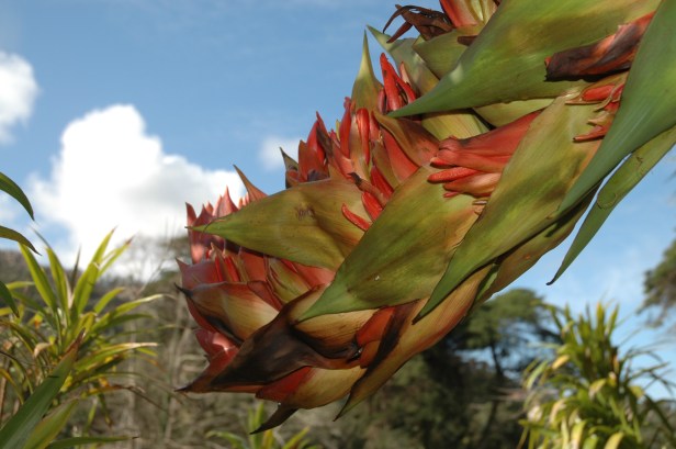La primera parte del jardín es un jardín forestal con sombra que se aferra a una pendiente empinada. Un camino en zig-zag lleva al visitante por la ladera de la colina, revelando constantemente vistas sobre las copas de árboles y arbustos de abajo. Los árboles son una mezcla de robles nativos, acebos protegidos raros y especies introducidas como pinos de paraguas, Rhododendron arboreum (floración vista arriba) y especies de araucaria. El sotobosque y la cobertura del suelo incluyen especies exóticas como bromelias, monstera (costilla de Adan o planta del queso ), fucsias y helechos arborescentes, mezclados en esta época del año, con nativos más comunes como las prímulas, centaureas y violetas.