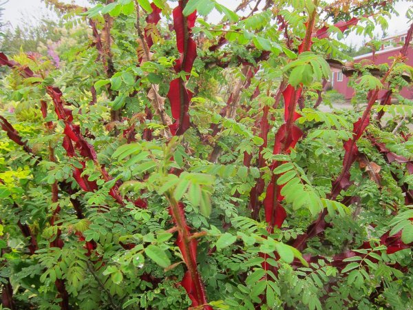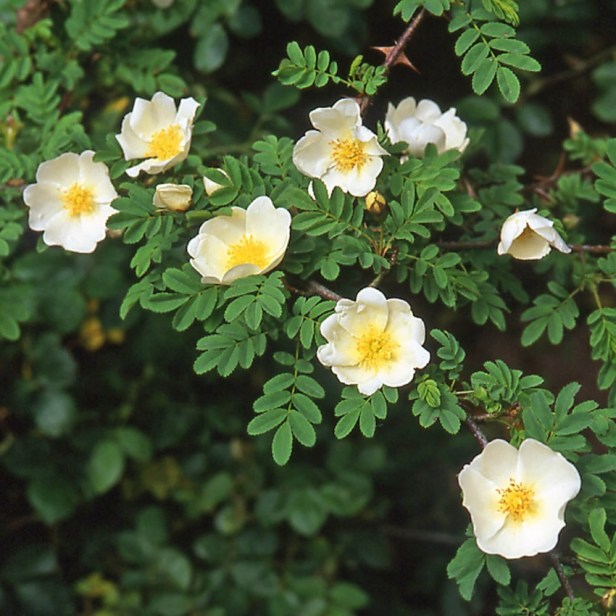 Esta rosa, Rosa sericea pteracantha, es conocida por sus magníficas espinas rojas, aunque Gerald nos dijo que ha habido una discusión reciente entre los botánicos sobre si realmente es una rosa, ya que las flores solo tienen cuatro pétalos en lugar de los cinco habituales.