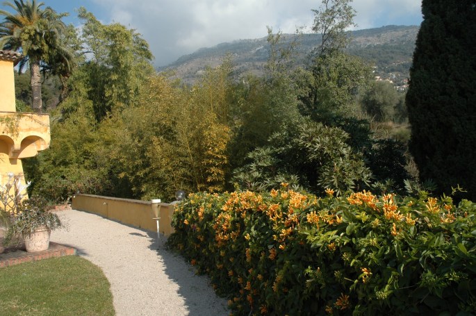 Rodeado de plantas con formas, colores y fragancias excepcionales, agaves gigantes, Syagrus romanzoffiana, cordylines verdes y rojos, daturas, Beaumontia grandiflora, buganvillas rojas, Citrus, kumquats, Thunbergia grandiflora azul, Caryota urens, la villa en su entorno vegetal como uno de los últimos testigos de las grandes horas de Mentón y debe permanecer sobre todo un lugar de esplendor.